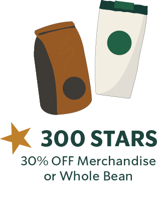 - 300 Stars: 30% off merchandise or whole beans (\*excluding seasonal items)