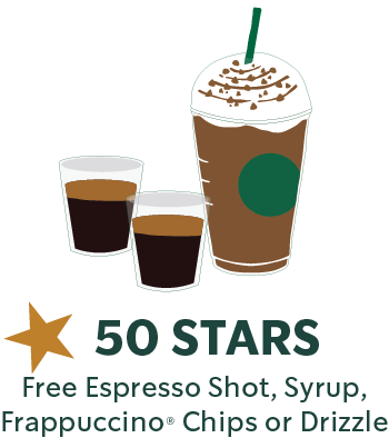 - 50 Stars: Free espresso shot, drizzle, syrup or Frappuccino chips