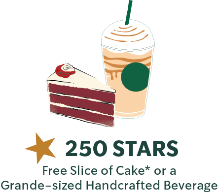 - 250 Stars: Free slice of cake or a Grande-sized handcrafted beverage (\*including promo beverage)
